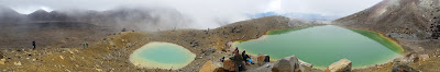 At this point of the route there was an option either to go on or to climb the crater of Mt Doom but as the clouds were so dense that we could barely see a few meters head we decide not to climb as there was no view to justify the additional 3 hours needed. So we continued to the next crated - call Red as the soil is really red. At the rim we decided to sit down and wait for a while for the clouds to scatter (fingers crossed) and there was a huge surprise - the ground was warm. Some time later when the clouds did actually disappear we saw what was the reason behind the warm ground - there was steam coming out of the ground all around us. And the other awesome surprise which we would have missed if we had not decided to relax on the rim for a while - the Emerald lakes. We were so lucky that we did not miss that view and behind the lakes finally we could see the path ahead, leading right through a huge smoking crater. A natural steam bath with nice sulfur smell :)